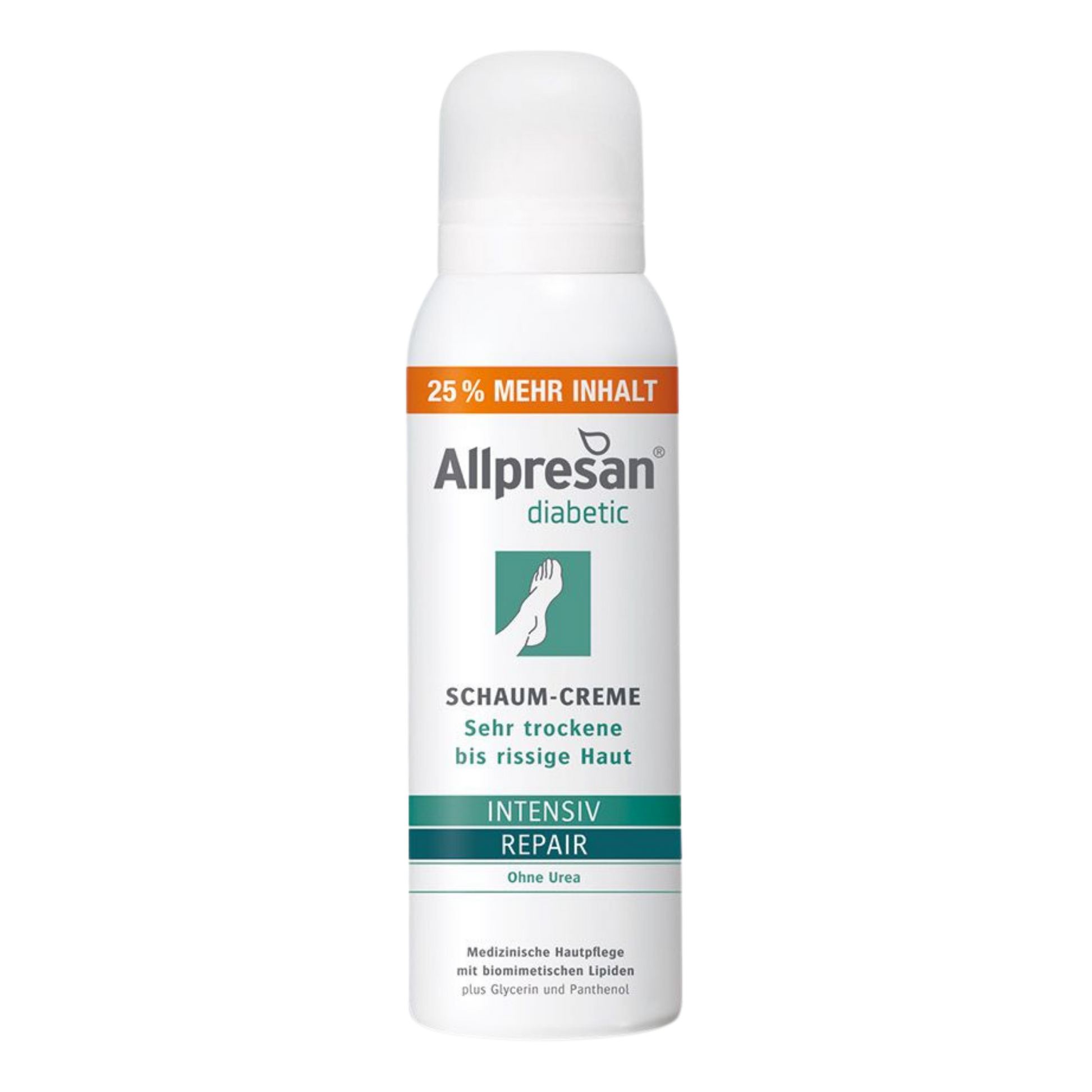 Die Allpresan diabetic Schaum-Creme INTENSIV + REPAIR ohne Urea wurde zur täglichen Pflege sehr trockener und rissiger Fußhaut bei Diabetes mellitus entwickelt. Die Schaum-Creme versorgt die Fuß-und Beinheit intensiv mit Lipiden und Feuchtigkeit. Die patentierte Technologie stärkt die physiologische Hautbarriere, damit die Feuchtigkeit nicht entweichen kann. Die Schaum-Creme auf Basis der Allpresan Haut-Repair Technologie ist speziell abgestimmt auf die Bedürfnisse diabetischer Haut.