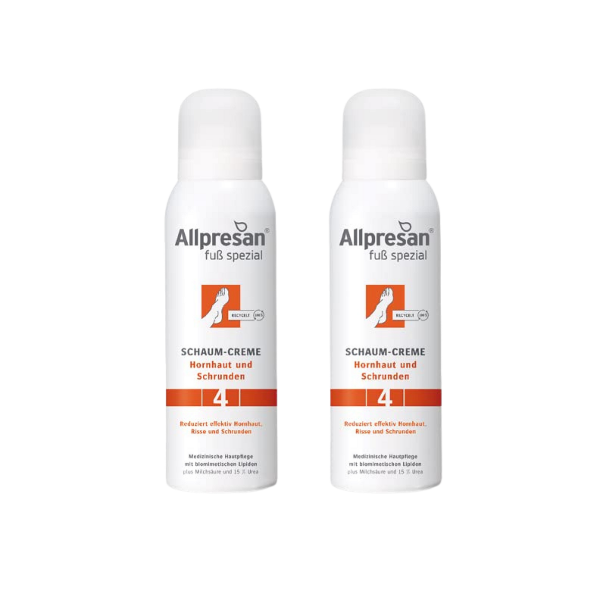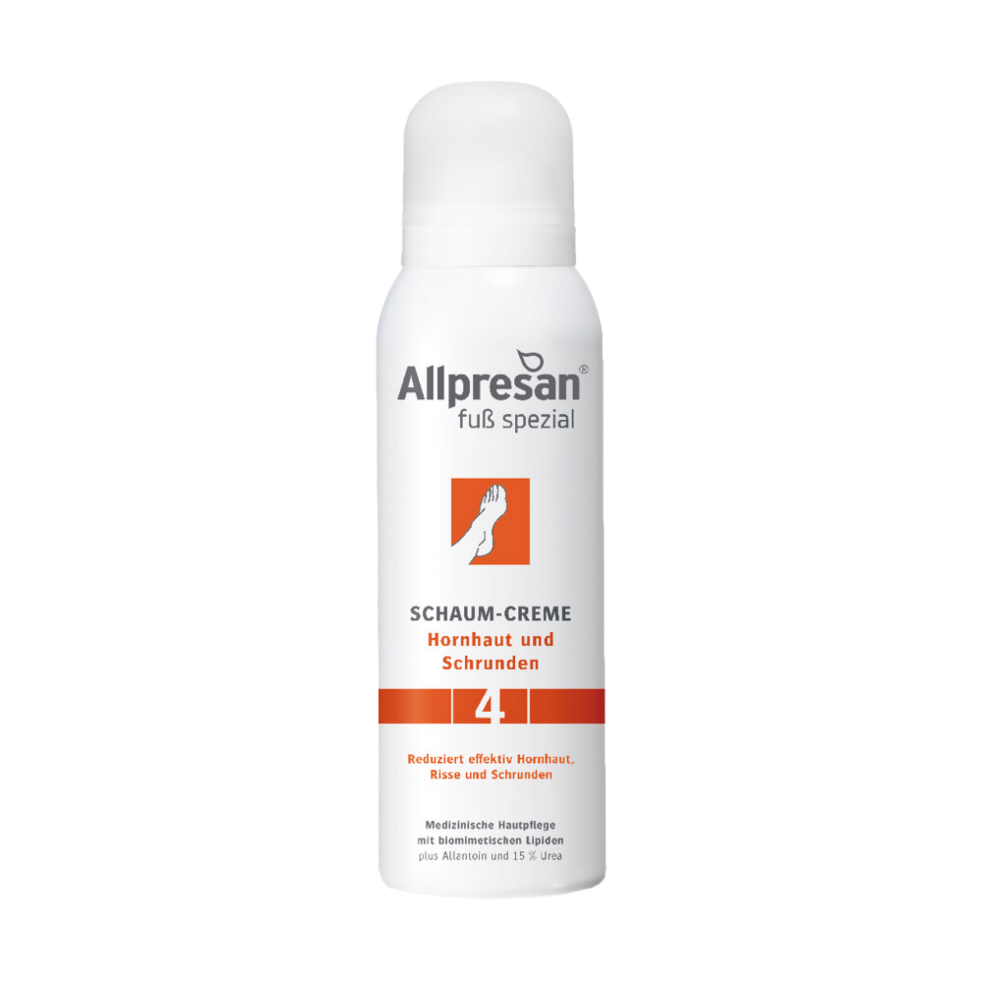 Auf dauerhaften Druck und Reibung reagiert die Haut an den Füßen mit der Bildung von Hornhaut. Daraus können kleine Risse bis hin zu Schrunden und Rhagaden entstehen, die nicht nur optisch störend, sondern auch schmerzhaft sein können und die natürliche Barrierefunktion der Haut beeinträchtigen. Die Allpresan Fuß spezial Nr. 4 Schaum-Creme ist speziell für die intensive Pflege der Haut an den Füßen bei Hornhaut und Schrunden entwickelt worden. Die Rezeptur mit 15 % Urea und Allantoin reduziert wirksam Hornhaut, Risse und Schrunden und wirkt ihrer Neubildung effektiv entgegen. Die biomimetischen Lipide erhöhen zudem den Feuchtigkeitsgehalt der Haut und tragen zur Regeneration der Hautbarriere bei.