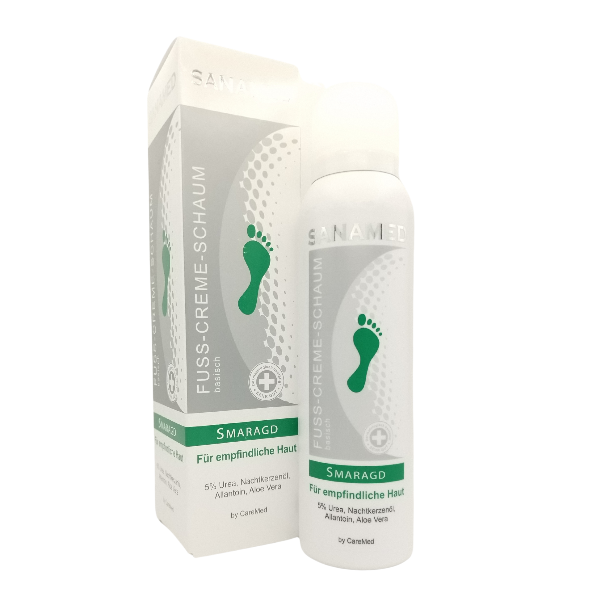 SANAMED Smaragd ist ein Fußcreme-Schaum für höchste Ansprüche. Wertvolle Inhaltsstoffe wie Nachtkerzenöl, Allantoin und Aloe Vera pflegen eine trockene Haut spürbar. Ein Urea - Anteil von 5 % versorgt die Haut mit ausreichend Feuchtigkeit.